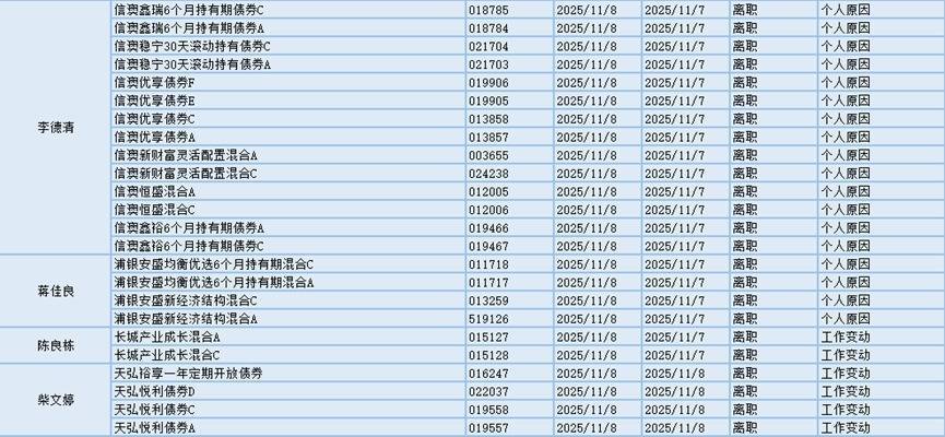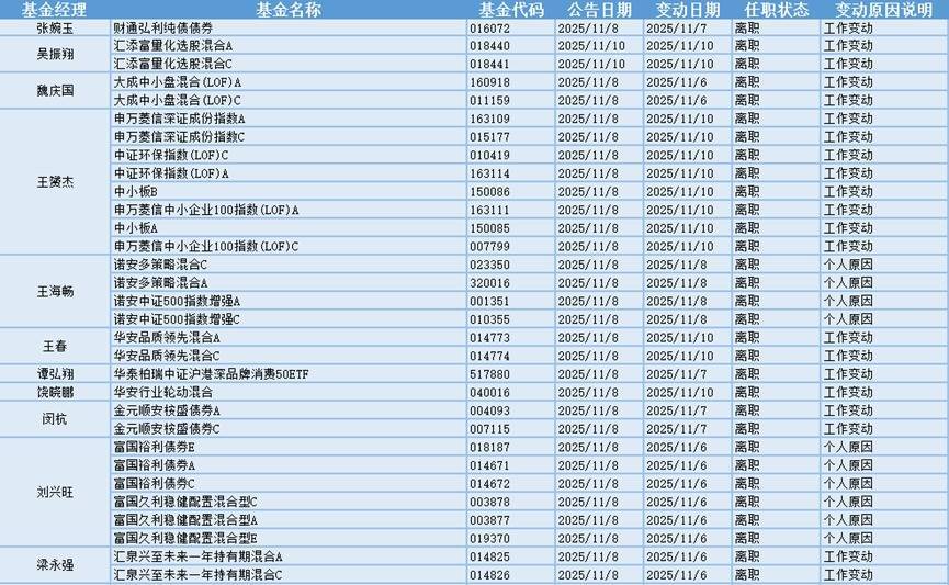 根据巨灵统计的数据显示美牛股,近30天(10.11-11.10)共有560只基金产品的基金经理发生离职变动。其中今天(11.10)有55只基金产品发布基金经理离职公告,从变动原因上来看,有11位基金经理是由于工作变动而从管理的27只基金产品中离职,有4位基金经理是由于个人原因而从管理的28只基金产品中离职。