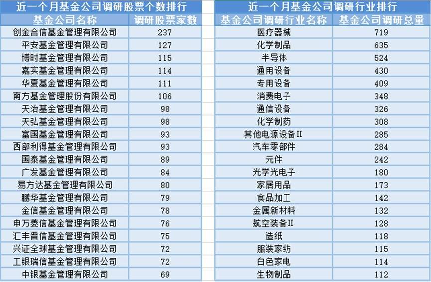 近一个月(10月11日-11月10日),创金合信基金参与公司调研的数量最多,共调研237家上市公司,然后调研较为活跃的还有平安基金、博时基金和嘉实基金,分别调研127家、115家、114家上市公司;从调研行业上来看,基金公司对医疗器械行业的上市公司调研次数最多,共有719次,其次是化学制品行业,基金公司调研了635次。