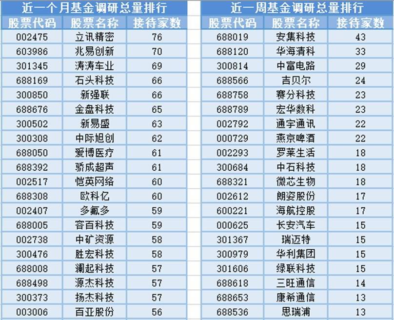 将时间周期缩短到最近一周(11月3日-11月10日)来看,基金调研数量第一的公司是安集科技,属于半导体行业,主营业务为关键半导体材料的研发和产业化。共被43家基金机构调研,然后被调研数量较多的股票是华海清科、中富电路和吉贝尔,分别接受33家、29家和24家基金机构的调研。